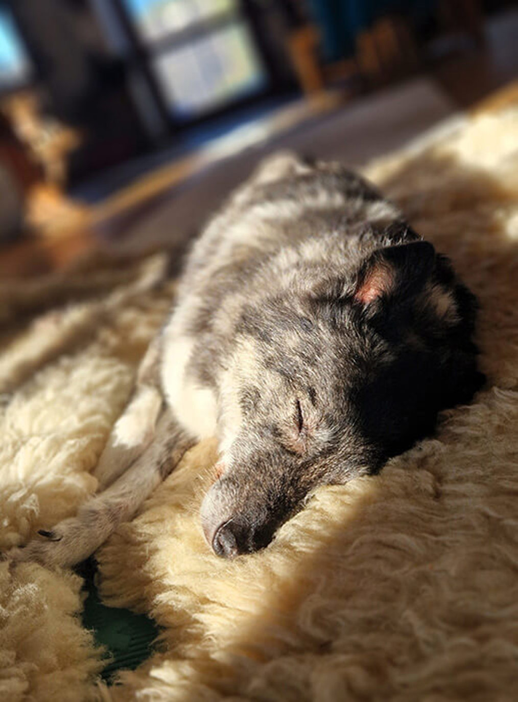 Die letzten Wochen hat Eva all unsere Schaffelle, auf denen sie so gern lag, genommen und ihr einen schönen Platz des Rückzugs im Wohnzimmer eingerichtet.