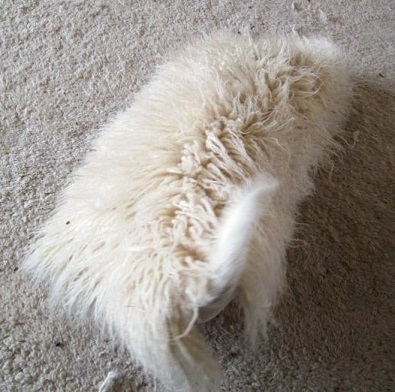 die Fransen-Wolldecke gehört Annabell und liegt in der kalten Jahreszeit vor dem Kamin. Manchmal schüttelt sie sie, als wäre sie ein Feind. Dann fällt die Decke schon mal über den kleinen Hund, dabei entstanden die mitgeschickten Fotos. Sehr gerne spielt sie mit dem Hund meines Sohnes. Sie sind ein Herz und eine Seele. Bei uns hat es heute Nacht geschneit, da hat die Kleine erst mal den Schnee beschnuppert. Die Sonne hat ihn jetzt schon verschwinden lassen. Wenn wir am Nachmittag unseren langen, obligatorischen Spaziergang machen gibt es den letzten Rest auch nicht mehr. Nur die Kälte wird uns wieder daran erinnern, dass wir uns zum Kamin setzen könnten.