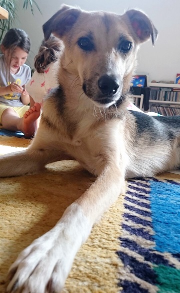 Er hat sich sehr gut eingelebt und in diesen wenigen Wochen schon unglaublich viel gelernt.... Er begleitet uns fast überall hin, er hat sich mit Pferden gut angefreundet und auch schon einige feine Spielpartner gefunden! Mit jedem Tag wird er neugieriger und aufgeschlossener und er und meine beiden Töchter sind dicke Freunde! Wir haben eine sehr große Freude mit ihm und ich denke, er auch mit uns....