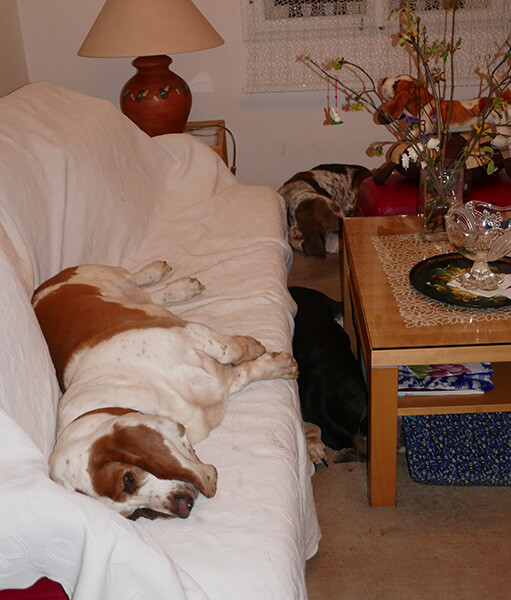 Ich glaube Angelo (wir haben ihn umgetauft: Archie), also Archie scheint sich langsam einzuleben. Streicheln kann man ihn ohne Ende (normal für Bassets), viel Schlaf, neugierig herumschnüffeln - seine Welt.