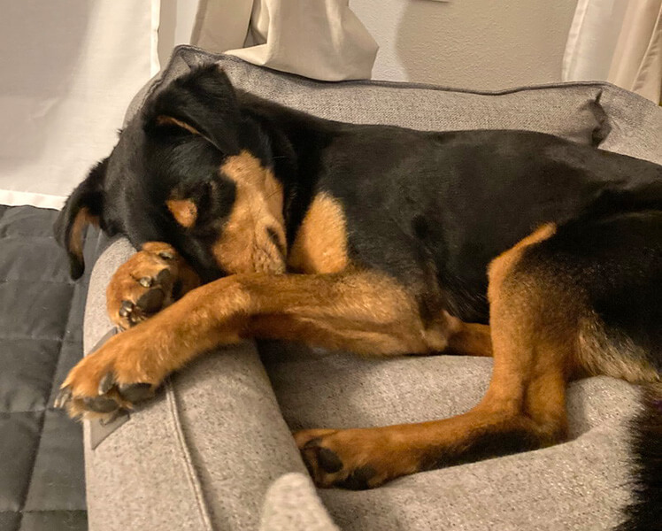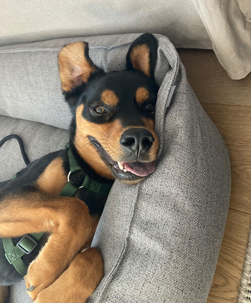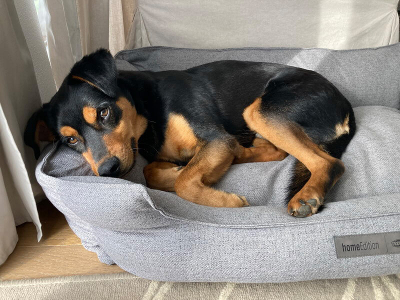 Arni hat sich sehr gut bei uns eingelebt. Er liebt die langen Spaziergänge, die Kuscheleinheiten und sein Hundebett 😄
