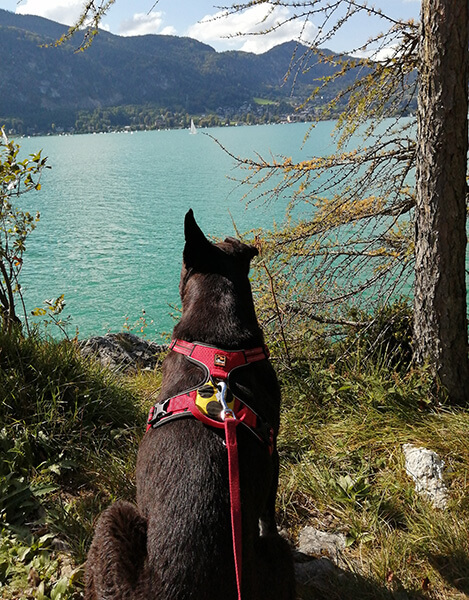 Jetzt, am Ende der Ferien, bist du ein liebenswerter, selbstbewusster, cooler Hund, der uns als seine Augen vertraut, super gern im See schwimmt (endlich keine Straßenlaternen, Autos, Randsteine im Weg) und immer besser alleine bleiben kann weil er weiß: die kommen wieder, denn ich gehöre zur Familie 😊