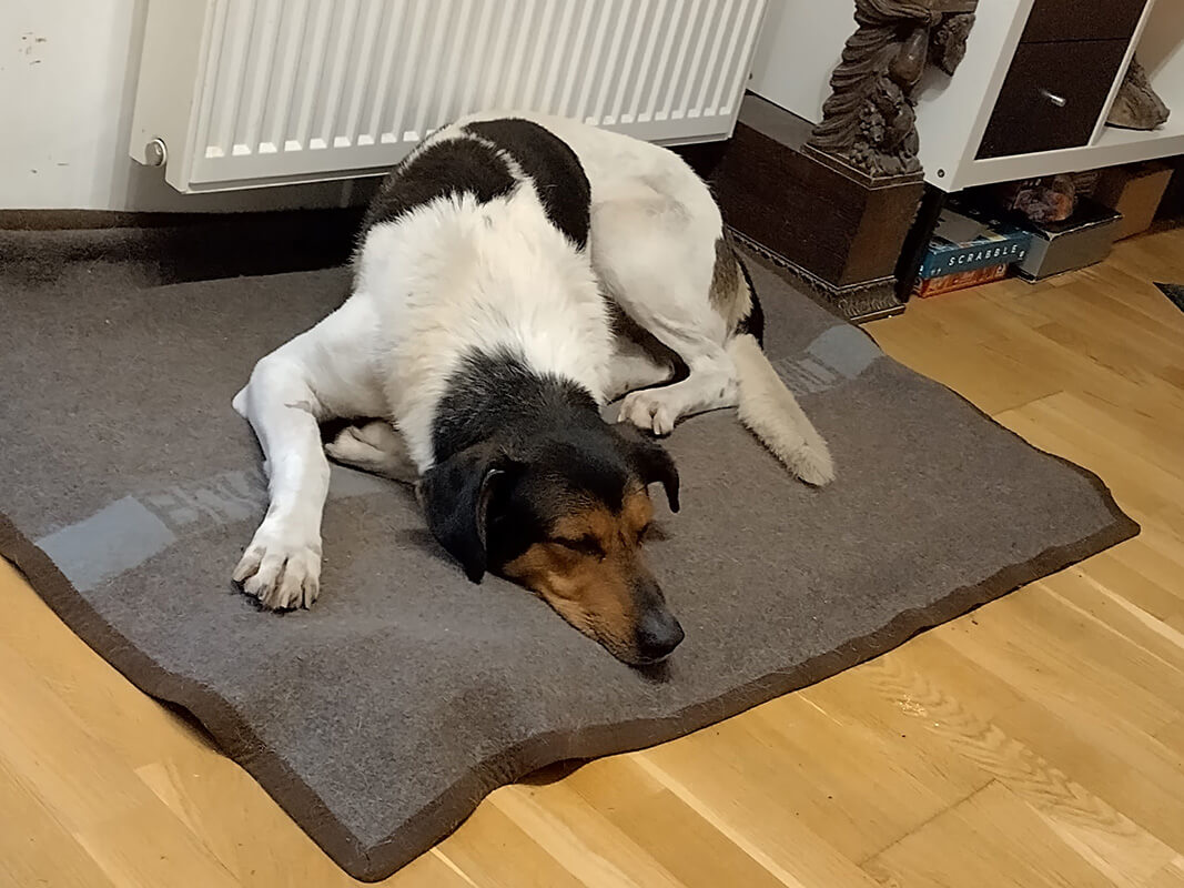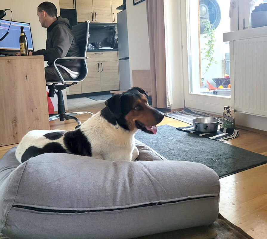 Auf einer Angstskala von 0-10, wobei 0= nix und 10= Todesangst ist, ist er irgendwo zwischen 2 und 3. Also so gut wie gar nichts. Er hat die Wohnung in Besitz genommen. Hat sich ohne zeigen oder so seinen Platz eingenommen, wo er entspannt und ruhig tief schnarchend schläft. Er geht super gut an der Leine. Ohne Ziehen. Ohne Stress. Also Spazierengehen ist null Problem. Ja, er erschrickt ganz kurz bei neuen Reizen (Scatern, lauten Motorrädern, lauten Sirenen von Polizei oder Rettung Highheels, ...) und er ist urlustig. Er lässt sich streicheln und lernt buchstäblich stündlich dazu. Er ist soviel leichter zu handeln, als wie uns jemals vorgestellt haben. Er ist ein viel einfacherer Hund, als man in der Tierstation in Ungarn jemals glauben hätte können.