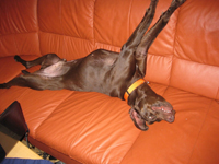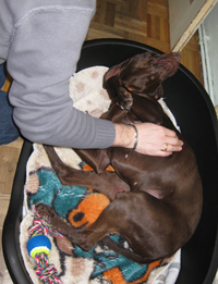 Gefressen hat er auch schon und jetzt schnarcht er(das macht er wirklich gut) in seinem Körbchen.