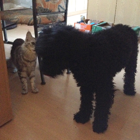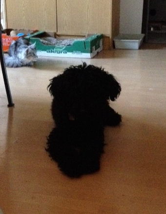 Mit den Katzen kommt er wunderbar klar. Meine Katzen sind ja so einen schwarzen Wuschel als Hund gewöhnt, und so hat es sie überhaupt nicht verwundert, dass da wieder einer ist. Der Hund hat sich vollkommen neutral verhalten und so hat es gar nicht lange gedauert, bis er zusammen mit den Katzen im Vorzimmer gelegen ist. Sogar meine ganz scheue Katze mag ihn und liegt bei ihm.