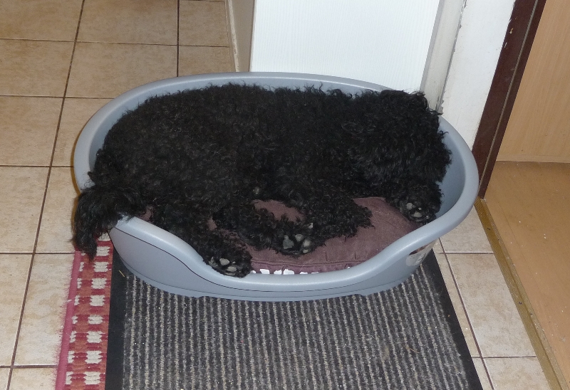 Letzte Neuigkeiten: er gibt unaufgefordert Pfote, er gibt Bäuchlein zum Kraulen und er benützt sein schönes neues Hundebett. Und er versteht „geh auf deinen Platz“ so wie er auch das Handzeichen für „Platz“ versteht. Dieser Hund überrascht mich stündlich mit neuen Dingen. Ich lerne es ihm nicht – er macht es einfach von selbst!!!