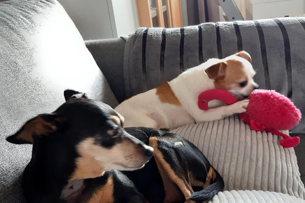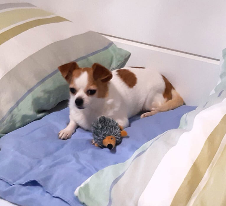 Sie ist sehr anhänglich und bereits lustig und verspielt. Leckerchen und Essen liebt sie und den Schlafplatz am Kopfende unseres Bettes sowieso. Nächste Woche wird ihr Gebiss saniert, unsere Tierärztin Fr. Dr. Shibly hat sie auch schon untersucht und dazu das ok gegeben. Einzig das Gassigehen ist noch sehr Angstbesetzt trotz des Beiseins unserer Lilly, aber die Welpentasse benützt sie sehr brav.