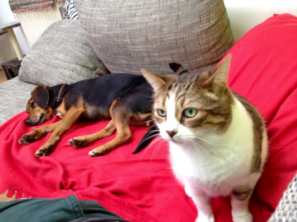23.08: Nachdem wir die Übergabe geregelt hatten und fertig für die Heimfahrt waren, packten wir sie in den Kofferraum in der Hoffnung sie würde nach dem langen Spaziergang einfach ruhig schlafen. Natürlich war dem nicht so. Da sie sehr menschenbezogen ist, setzte ich mich mit ihr auf die Rückbank. Sie war die ganze Autofahrt über ganz brav und schlief auch ziemlich schnell auf meinem Schoß ein. Zuhause angekommen ließen wir sie erst an der Leine die Wohnung erkunden. Ihr fiel natürlich sofort auf, dass wir 3 Katzen haben, welche sich erstmal zurückgezogen hatten. Zum Glück dauerte es nicht lange bis sich unser Kater sich ihr annäherte. Bella war ihm gegenüber sehr verunsichert aber dennoch neugierig und freundlich.