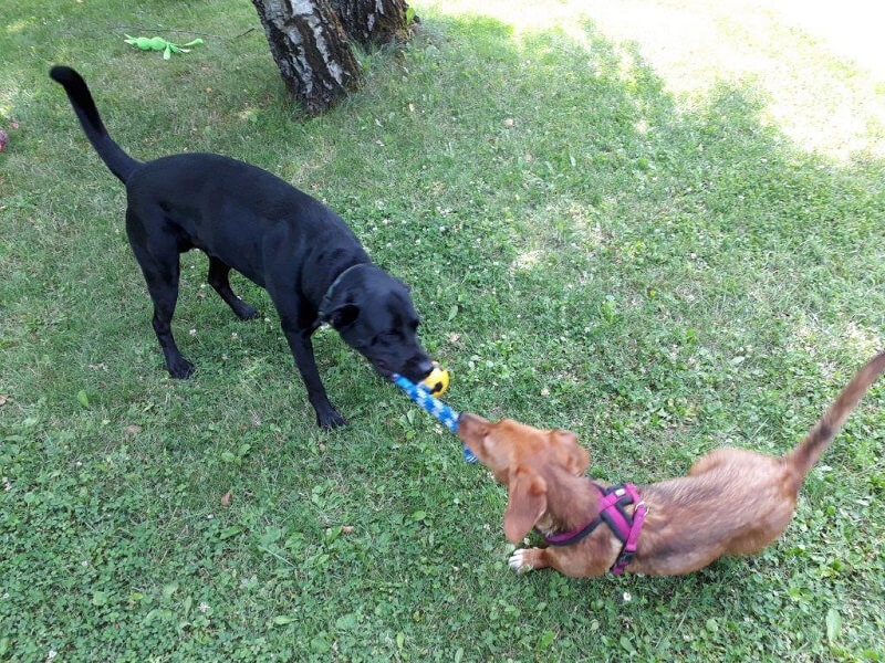 Sie ist sehr lebendig und manchmal ein wenig sekkant zu Ricco - er lässt sich alles gefallen (Wadenbeissen, Leckerli aus dem Mund klauen). Aber sie tut ihm auch sehr gut. Er liebt es, Seil ziehen mit ihr zu spielen und wer ist schneller ums Haus herum.