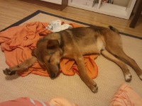 Seine Wunden verheilen sehr gut. Ich schmiere fleißig Bepanthen drauf - was ihm glaub`ich gar nicht mal so schlecht gefällt, weil er sich immer von selbst auf den Rücken dreht und die Beine spreizt :) Er chillt dann richtig ab und schläft dann auch in dieser Position ein, so dass die Creme gut einziehen kann.