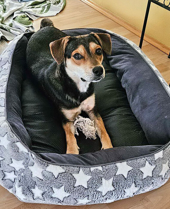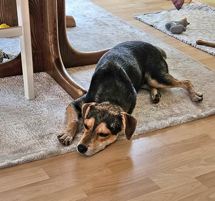 Wir haben ihm sein Bettchen im Wohnzimmer eingerichtet unter den Esstisch, wir müssen ihn so wie sie sagen immer mit sanfter Gewalt unter den Tisch hervorholen.