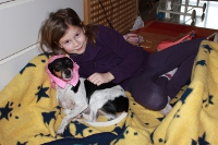 Anbei ein Foto von Boogie und meiner Tochter. Wie Sie sehen, sind die beiden immer noch ein Herz und eine Seele. Boogie spielt sogar Rotkäppchen!