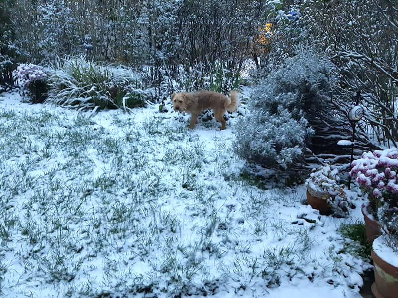Gekostet hat die ganze Behandlung (inklusive der Advokat Tropfen) rund EUR 300,-. Anschließend hat Boomer auch gleich den ersten Schnee in unserem Garten markiert...