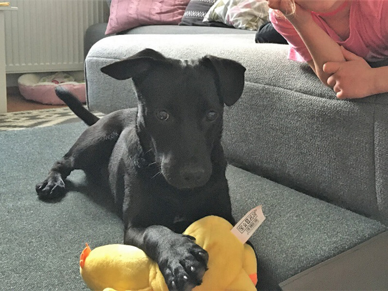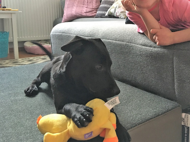 Er hat sich schon sehr gut in die Familie eingelebt und ist ein toller Weggefährte für unsere Tochter Mira. Die beiden verstehen sich ohne Worte. Er ist sehr sanft zu ihr und spielt gerne mit dem Ball oder einem Stöckchen. Mira hat ihm sogar ein paar Stofftiere abgegeben.