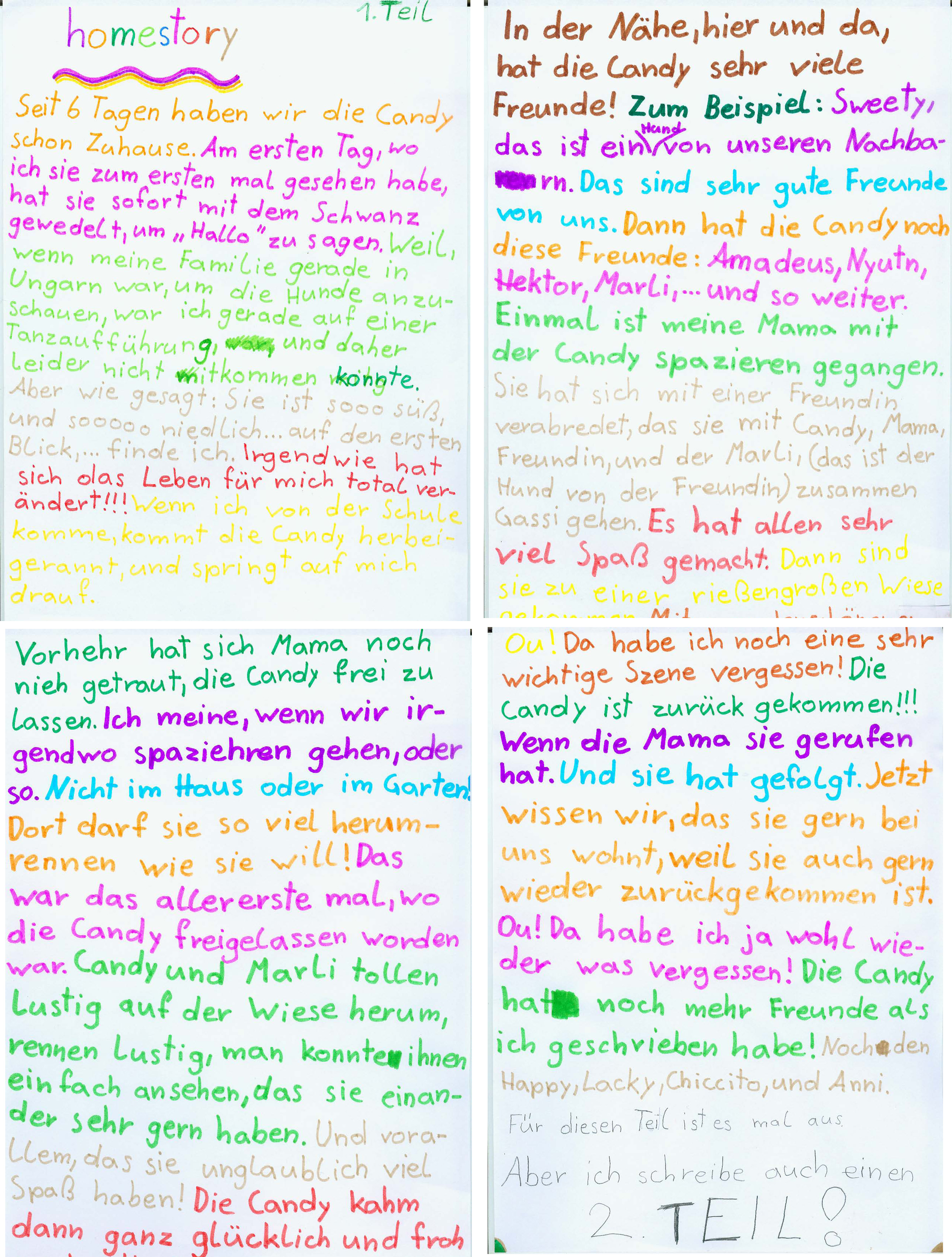 Jetzt endlich sind wir dazugekommen die homestory über Candy abzuschicken - unsere 9-jährige Tochter Teresa hat ihre Gedanken über das neue spannende Leben mit Candy aufgeschrieben. Auch für uns Eltern ist der Hund eine Bereicherung - wir gehen mit ihr im Wienerwald joggen, sie ist kinderlieb und zeigt keine Aggressionen. Wir haben eine Hundetrainerin gefunden, die uns hilft, und Candy lernt sehr schnell. Sie war ganz schnell stubenrein, jetzt sind wir gerade dabei ihr beizubringen, ins Auto in ihre Box zu springen - das wird glaube ich auch recht schnell klappen. Wir haben sie ins Herz geschlossen, und das geht auch allen unseren Bekannten so. In diesem Mail schicke ich die homestory von Teresa als PDF, und in einigen weiteren Mails schicke ich Fotos, ihr könnt gerne das alles ins Internet stellen wenn ihr wollt.