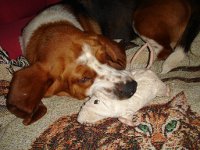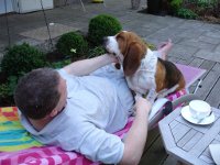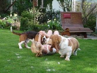 Gestern war das erste Mal wo er ihn auch kurzfristig ohne Leine laufen lies. Er kam jederzeit auf Ruf retour (was bei einem Basset ja nicht selbstverständlich ist