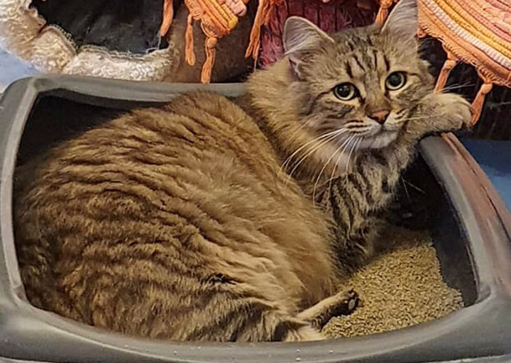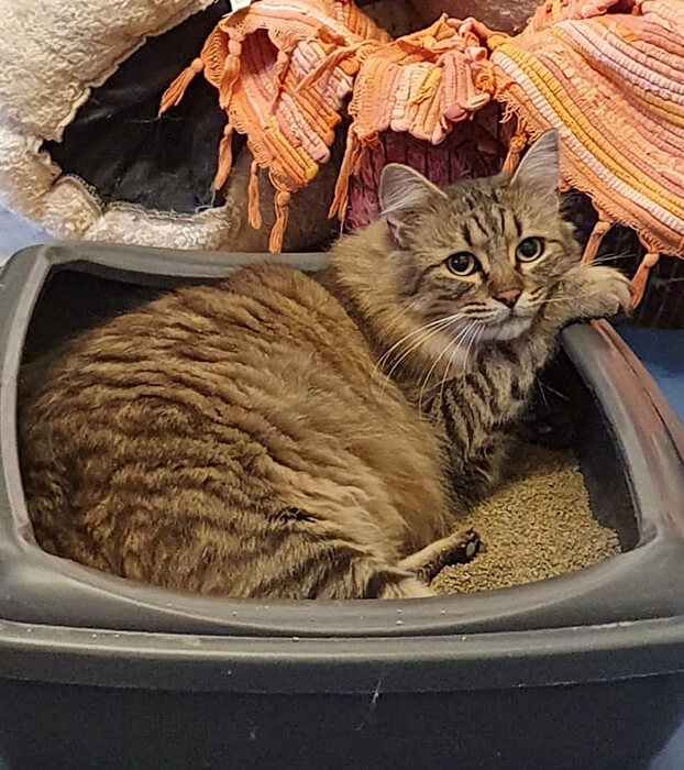 Er fühlt sich in den Räumen, die er momentan zur Verfügung hat, sichtlich wohl und erkundet langsam das restliche Haus. Inzwischen benützt er das Katzenklo nicht mehr zum Liegen …