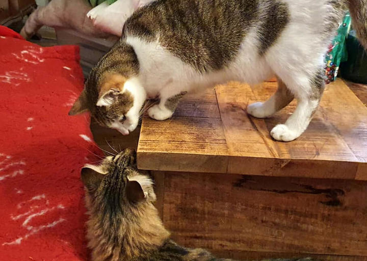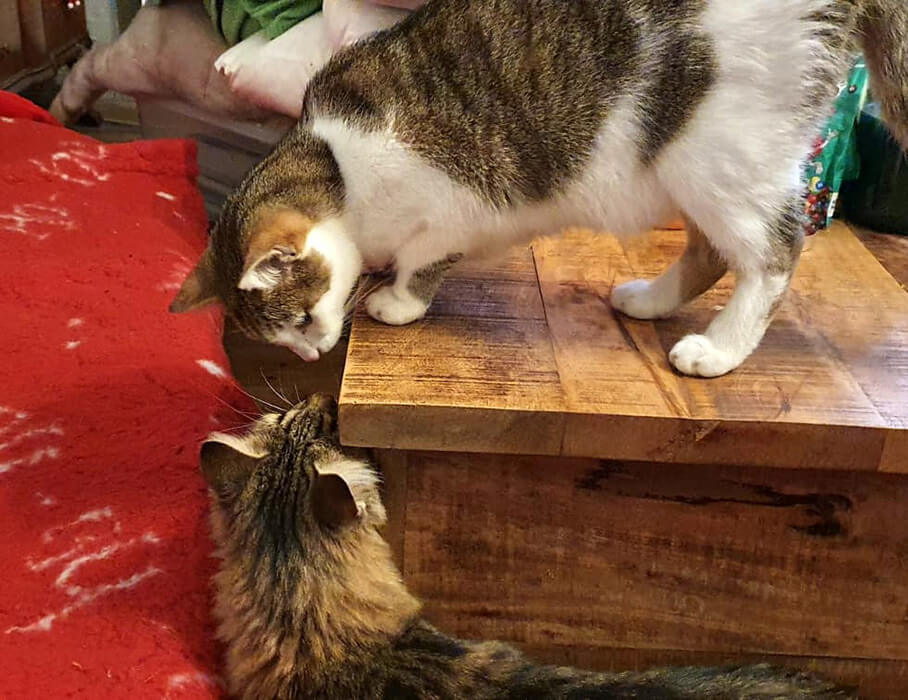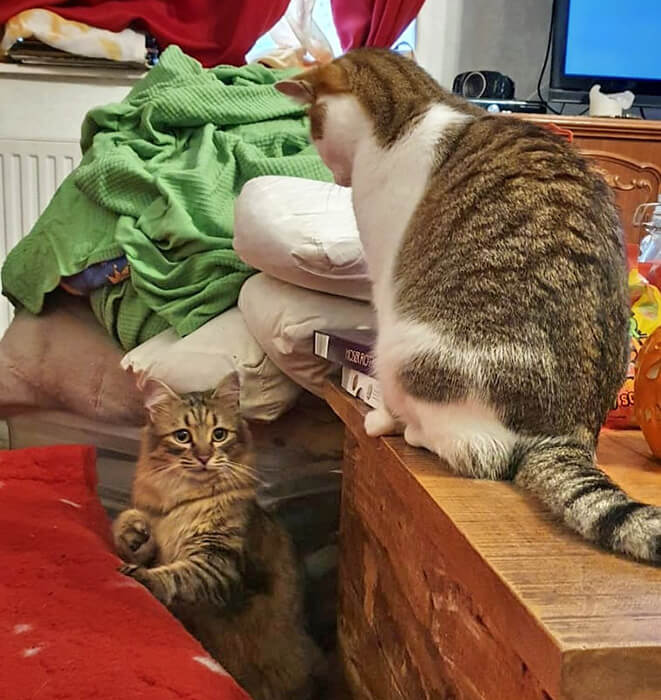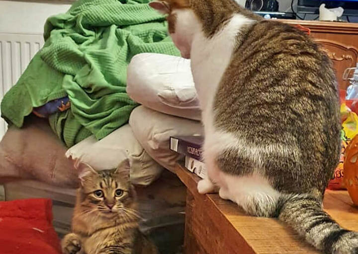 Danke für das Foto. Cicero geht es sehr gut. Er hat sich inzwischen schon ein bisschen mit unserem 4-jährigen Kater angefreundet (siehe Fotos). Er ist ein extremer und sehr süßer Schmusekater, von Menschenscheu keine Spur.