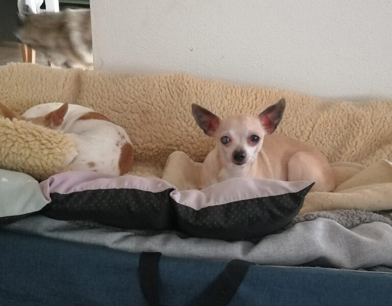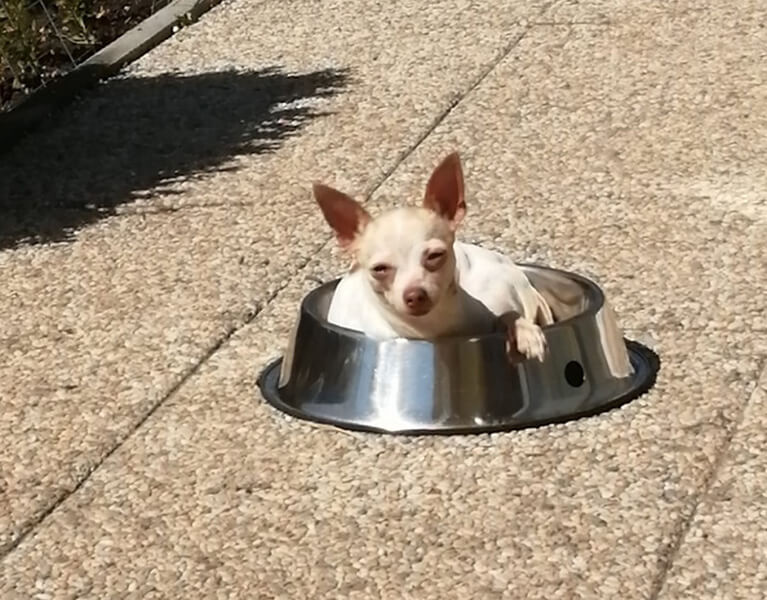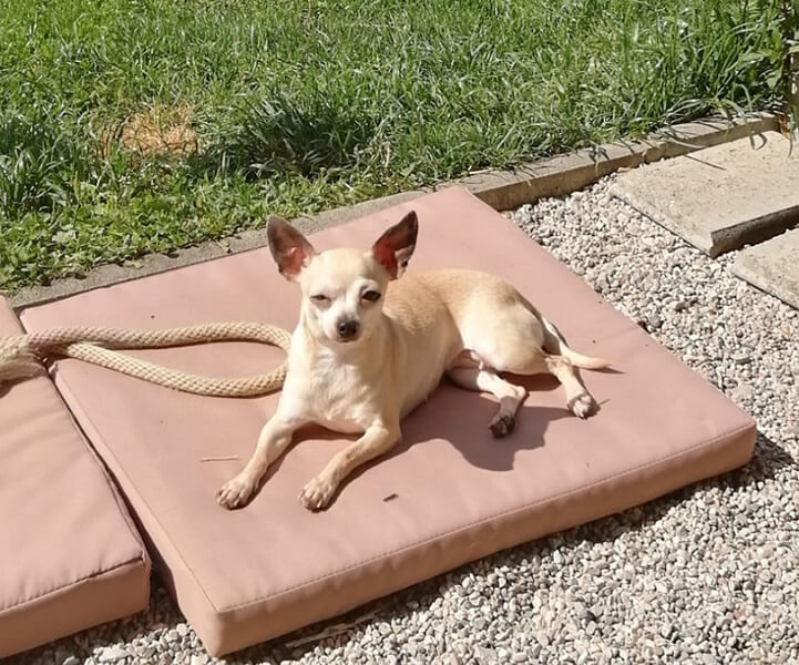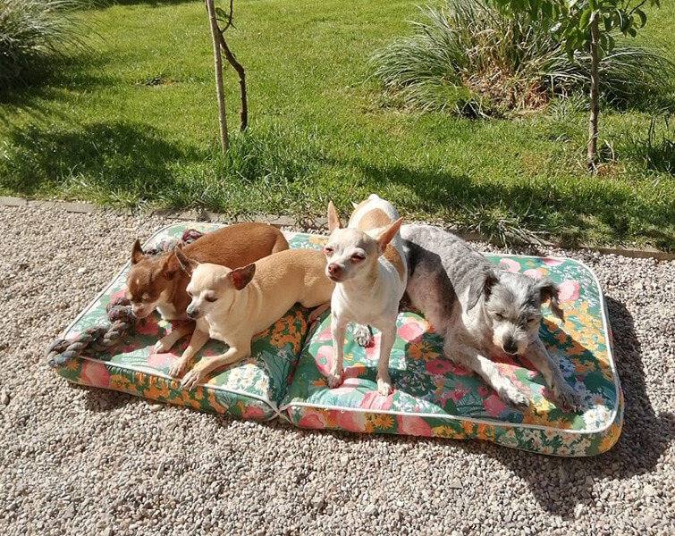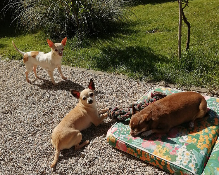 Wir genießen die Morgensonne mit unserem Rudel, wir sind voll integriert, fühlen uns sichtlich sehr wohl, waren gestern das erste Mal schwimmen (das war sehr lustig).