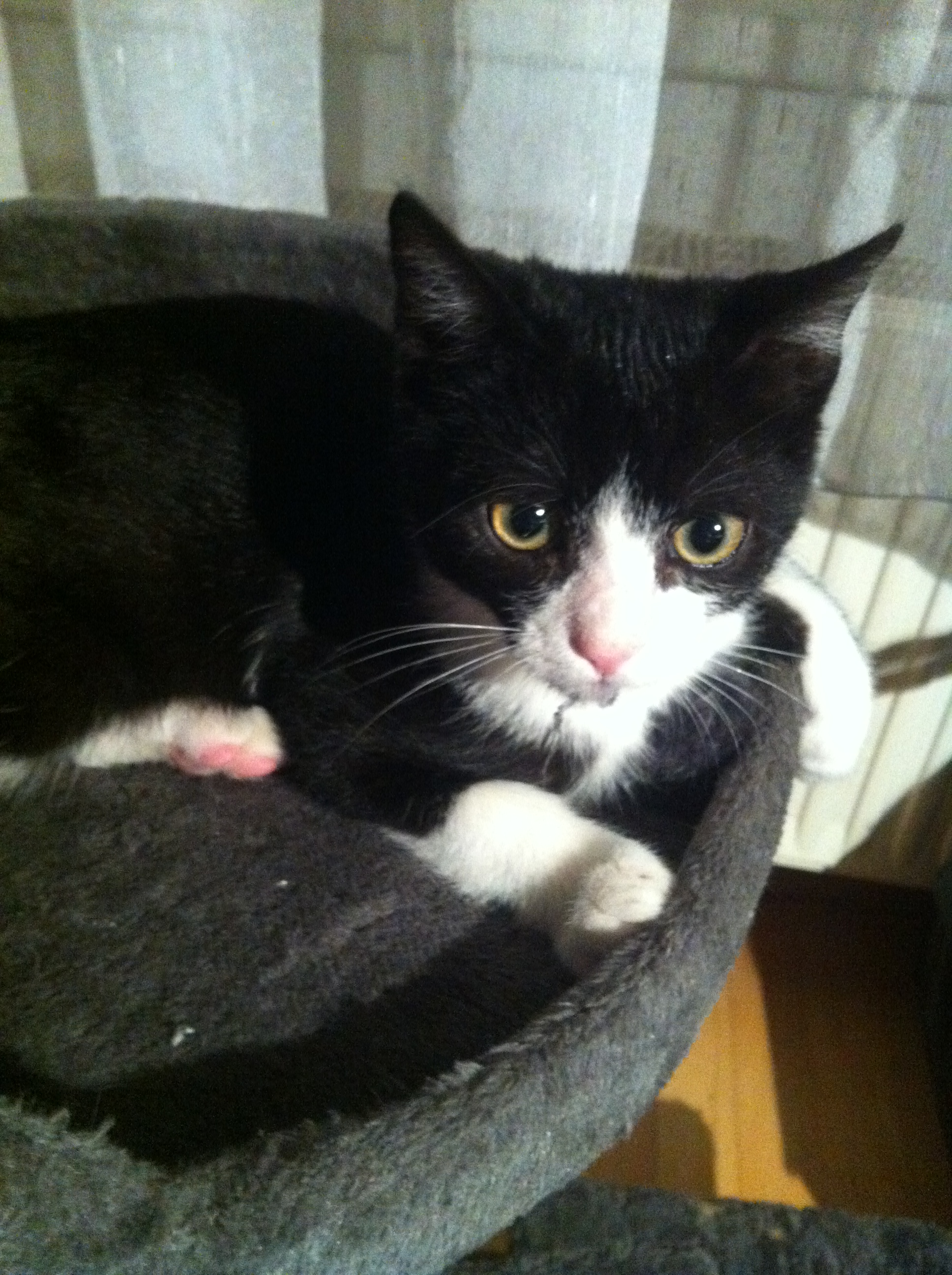 Hier geht alles gut - die beiden Katzendamen waren anfangs nur etwas irritiert mittlerweile lecken sie ihm das Fell und teilen mit ihm ihr Futter, so wie er sein Kidden-Futter mit ihnen  teilt. Kein einziges Mal hat er nicht ins Kisterl gemacht. Er hat ein Selbstbewusstsein wie ein Königstieger, eine Ruhe wie ein gras kauender Wasserbüffel und speeded mehrfach täglich durch die Wohnung und kriegt die Kurve ob seines Fliegengewichts nicht, aber das bessert sich. Neugierig, schlau und gewitzt. Ich glaub, das beschreibt ihn so weit.