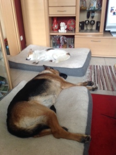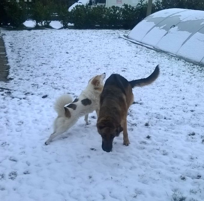 Auf den beiliegenden Fotos können Sie auch ersehen, dass die beiden bei den Spaziergängen superbrav sind und abseits von den Strassen auch ohne Leine unterwegs sind. Cyby&Gaby kuscheln miteinander, beginnen miteinander zu spielen und genießen vorallem die großen Hundepolster.