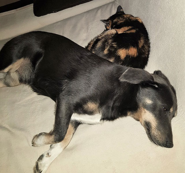 Er hat sich von Anfang an super in unser Familienleben bzw. Alltag eingefügt - mit den beiden Katzen war es ein langsames Herantasten, aber mittlerweile ist gemeinsames kuscheln auf der Couch möglich. :-)