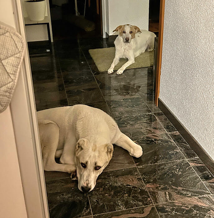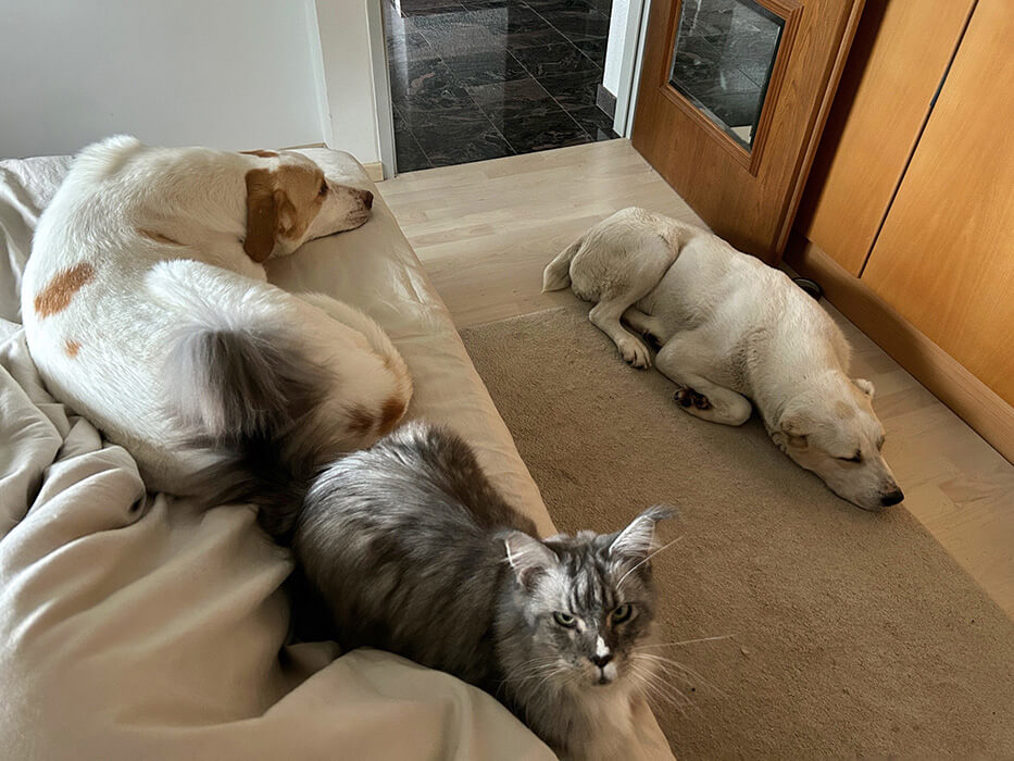Jetzt verstehen die 2 sich schon so gut! Liegen nebeneinander. Beim Füttern auch kein Neid mehr.