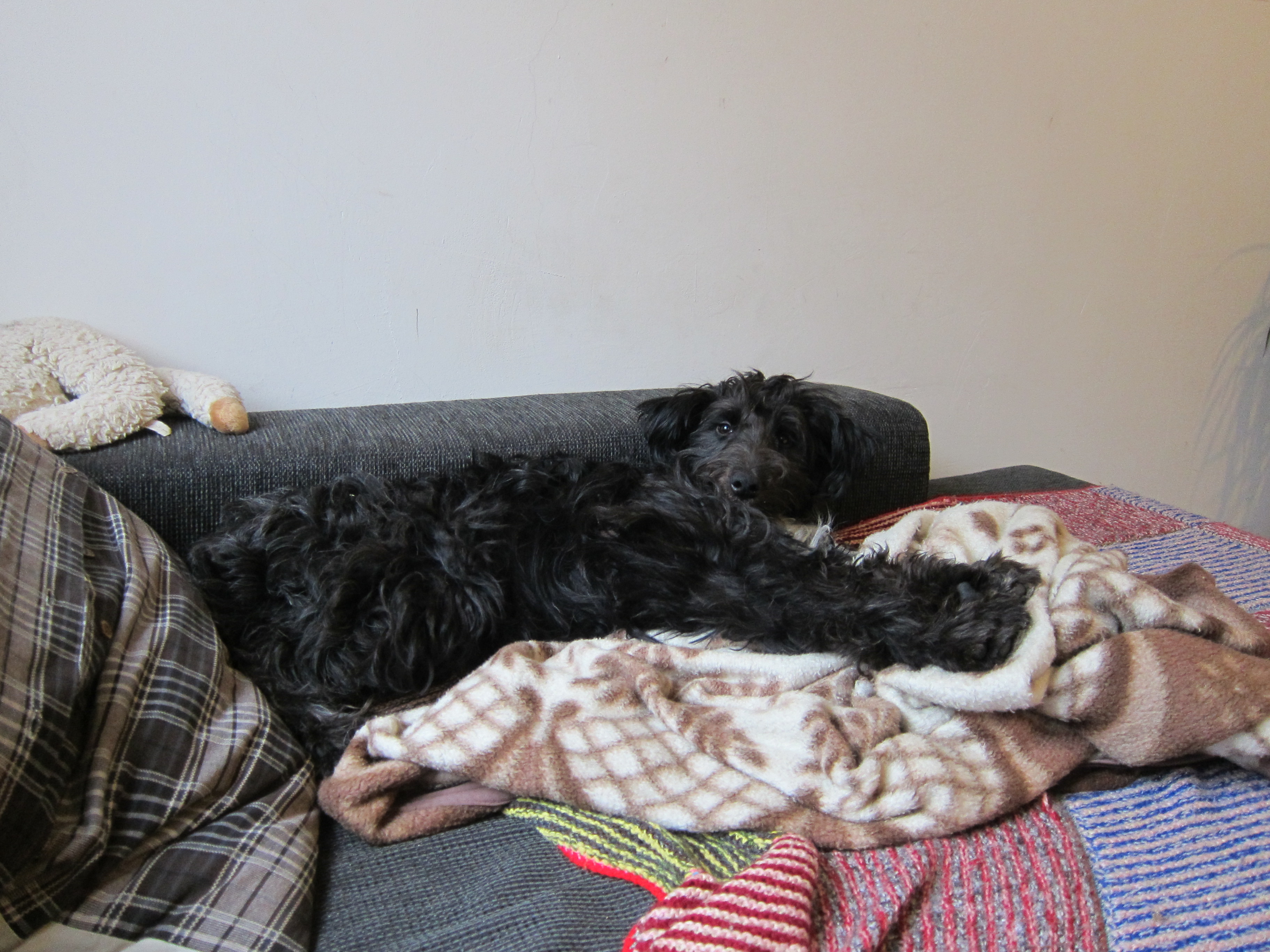 Dylan ist mittlerweile seit 4 Monaten bei uns und es geht ihm sehr gut. Er ist ein sehr sensibler und ängstlicher Hund, der nur ganz langsam Vertrauen zu Menschen und vor allem zu Männern fasst. Er hat leider noch immer sehr viel Angst in der Stadt, aber wir glauben, dass es mit weiterem Training besser wird. Wir haben ein paar Ausflugsziele gefunden, wo er sich mit seinen Hundefreunden und ohne viele Stressfaktoren austoben kann und versuchen fast täglich mit ihm in die Natur zu fahren. Dylan ist ein aufgeweckter, lustiger, frecher und vor allem sehr verschmuster Hund. Er hat sich mittlerweile gut eingelebt und fühlt sich zuhause sehr wohl. Wir freuen uns jeden Tag aufs neue, ihn bei uns zu haben! Ich habe Ihnen auch ein Foto von einem Treffen zwischen ihm und seinem Bruder Teddy geschickt. Die beiden Geschwister sind sich sehr ähnlich, nur ist Teddy weniger ängstlich.