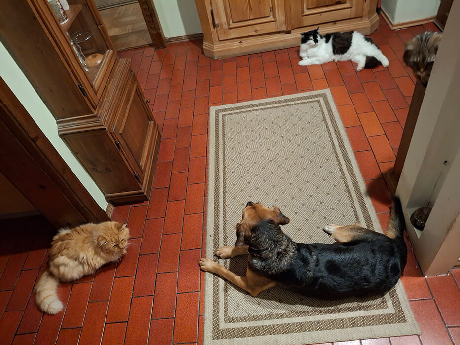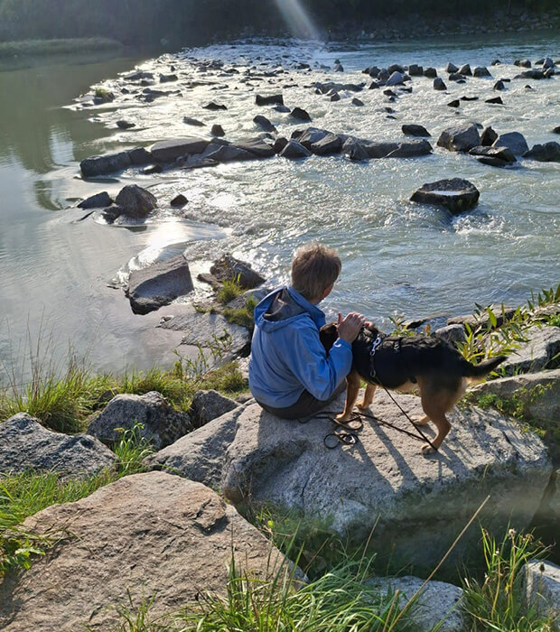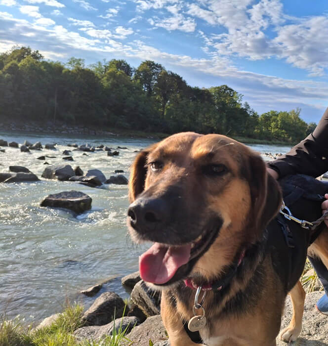 Bei den Hundebegegnungen war sie am Anfang sehr ängstlich, das wird auch schon besser, vor allem bei kleinen Hunden, da wird schon „zusammengeschnüffelt“. Bei großen Hunden ist sie noch ängstlich, aber das wird auch.