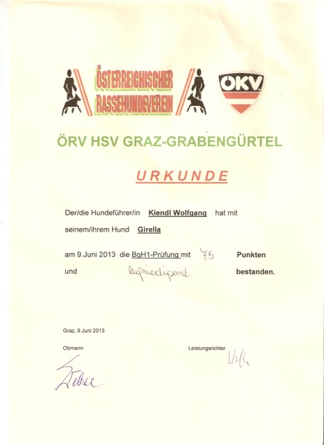 gestern hat Ella die BgH1-Prüfung bestanden, worauf wir alle sehr stolz sind! Die Ausbildung und Prüfung wurde in der gleichen Hundeschule (ÖRV HSV Graz-Grabengürtel), unter der kompetenten Leitung von Herrn Helmut Weber, wieder durchgeführt, in der Ella ihre BGH-Grundausbildung und erste Prüfung absolviert hat. Ella entwickelt sich sehr gut und sie scheint auch mit "Ihren Menschen" zufrieden zu sein.