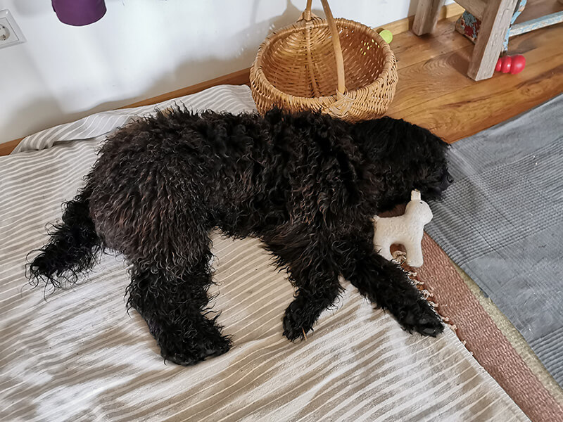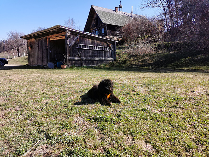 Er kann auch schon sehr gut ein bis zwei Stunden allein bleiben, da reichen die Katzen als Gesellschaft!