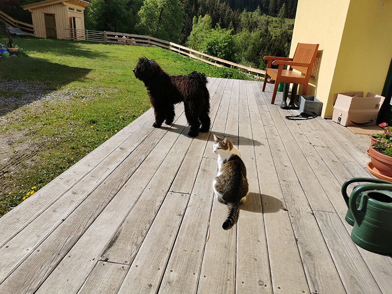 Emil geht sehr freundlich und nett mit unseren Katzen um, er versteht sich auch mit unseren beiden Schafen, die inzwischen noch dazugekommen sind!