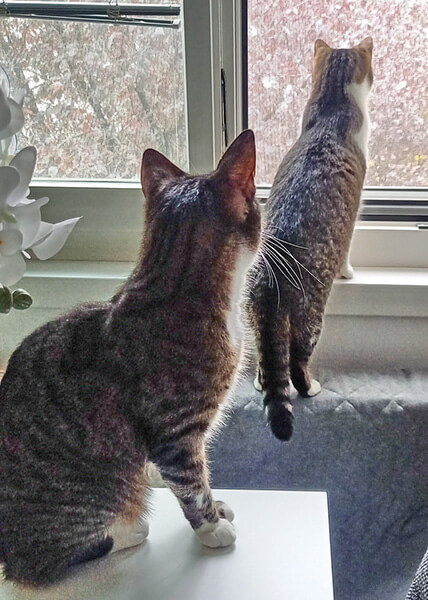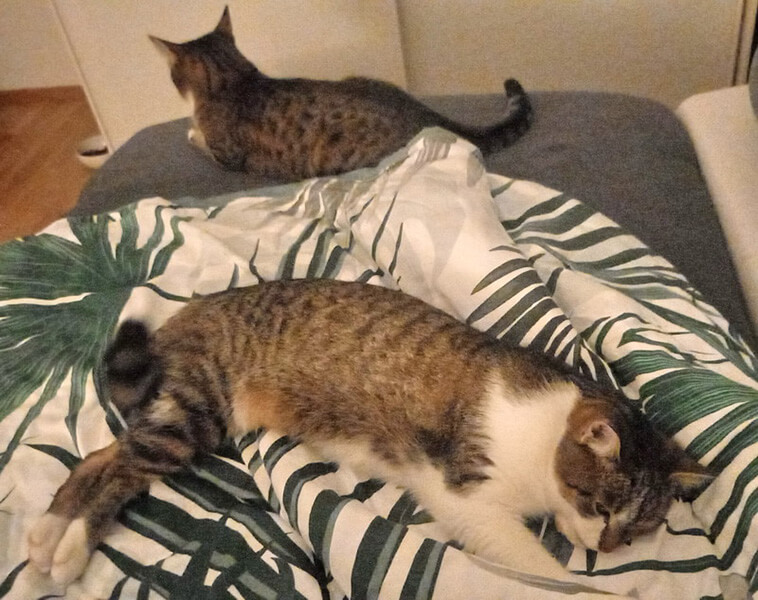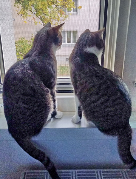 Jetzt gerade liegen beide im Wohnzimmer, sie auf der Fensterbank und er am Kratzbaum, beide schlafen :)
