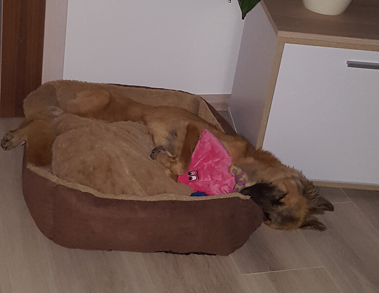 Ich wollte mich mal bei Ihnen melden. Ena hat sich sehr gut entwickelt bei uns. Sie ist schon sehr brav und hat schon viele Kommandos gelernt. Ena ist wirklich eine intelligente Hündin. Auch das Alleinebleiben klappt mittlerweile - wobei sie das nicht lange muss denn an den beiden Tagen wo ich ganztags arbeite, darf sie bei meinen Eltern im Haus warten und wird dort zweimal täglich für jeweils 1 Stunde von meinem Vater spazieren geführt.