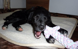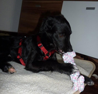 Jetzt haben wir den kleinen Mann schon fast drei Tage und wir sind alle sehr glücklich mit Ihm. Er schläft brav auf seinem Platz und er frißt auch schon brav. Beim Tierarzt waren wir auch schon und er ist regestriert und gegen die paar Flöhe die er hatte, haben wir auch etwas unternommen ;o)