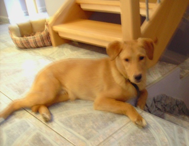 anbei Fotos von unserem Wirbelwind Frodo. Zugegeben, er stellte unser ganzes Familienleben auf den Kopf aber nicht wegen seiner Streiche. Und seine Blindheit scheint ihn nicht im geringsten zu stören. Er kennt es nicht anders. Unsere Sorgen, er könne DIES oder DAS nicht machen und mein Gott in unserem Haus gibt’s sehr viele Stiegen, ignorierte Frodo einfach. Die ersten Tage wurde alles mit Kinderschutzgittern hermetisch abgeriegelt. Langsam versuchten wir ihn an die neue Situation zu gewöhnen. Aber schau, schau… Frodo flitzte die Treppen rauf und runter, manchmal schneller als unsere Podencos und das heißt was. Die Holzstiege wurde nun gesichert und ist ein optischer Blickfang geworden UND Frodo hat sie erobert, man kann sagen null problemo, Frodo ist ein Genie im Stiegensteigen. Ich denke, auch wenn er mal ausrutscht, es kann nicht viel passieren. Und von wegen “blinde Hunde brauchen mehr Schlaf”. Das trifft auf Frodo ganz sicher nicht zu. Wenn sich die Mädels zurückziehen - na dann gibt’s immer noch 2 Katzen, die man jagen kann. :) Das restliche Hunderudel versteht in der Zwischenzeit auch seine andere Körpersprache und hat gemerkt, daß von Frodo keine Gefahr ausgeht. Mit Ami spielt er total lieb. Frodo knabbert an ihr herum (Schwanz, Ohren etc) und ist manchmal nicht sanft. Er hat sehr viel kräftigere Zähne als die Podis. Ami liebt ihn, die restliche Meute kann gut mit ihm umgehen. Pannica hat sich auch schon mit Frodo abgefunden. Sie vergräbt ihre Leckerlies im Garten mit der Schnauze!! Schaut lustig aus, wenn sie anschließend ein paar Bröckerl Erde wieder mit dem Schnauzerl draufdrückt und Frodo hats auch schon wieder wegschnabuliert. Unser bunter Haufen (2 Podencos, 1 Chihiahua-Spitz und nun Frodo) hat sichtlich viel Spaß miteinander. Frodo hat super grossen Hunger- da muss ich ein wenig vorsichtig sein- ein wenig futterneidisch ist er-kein Wunder!Ich muss sehr aufpassen, der kleine Müllschlucker ist fast nicht satt zu bekommen- scheint es zumindest. Ein kleines Bäuchlein hat er schon.