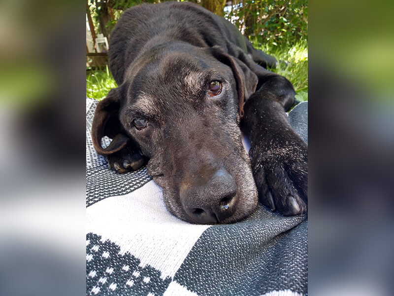 Aufgrund der neurologischen Problematik hat er seine Hinterläufe immer schlechter unter Kontrolle, aber dennoch verlaufen seine Tage gut (auch wenn er mir manchmal aus Versehen ins Beet plumpst, oder vom Gehsteig, oder…).