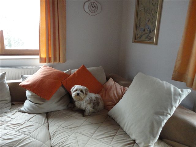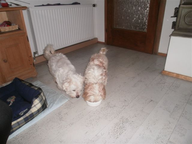 Nun ein paar Infos zu unseren neuen Mitbewohnern! Ich war ja schon immer ein karmisch denkender Mensch, aber manchmal ist es schon erstaunlich, wie sich die Dinge im Leben zusammenfügen! Chicco (vormals Austin) hat sich so gut eingelebt! Es ist beinahe so, als wäre er immer schon da gewesen, bzw. als würde er einfach zu uns gehören. In den ersten 3 Tagen schlief er nur am Boden,...sein neues Betterl hat er immer nur angesehen, als könnt er nicht glauben dass es ihm gehört. Ich frage mich oft, wenn ich in seine traurigen Augen schaue, was ihm wohl in seinem bisherigen Leben widerfahren ist!? In der Zwischenzeit genießt er es darin seinen Mittagsschlaf zu halten. Er fährt wahnsinnig gern Auto, sobald die Autotüre aufgeht sitzt er als erster drin. Abends, beim Fernsehen auf der Couch liegt er in der Mitte zwischen meinem Mann und mir. 2 - 3mal am Tag mag er Spaziergänge in seinem "neuen" Dorf. Er hat alle Hunde in der Nachbarschaft kennengelernt und versteht sich mit allen. Chicco ist ein so umgänglicher, dankbarer, lieber Kerl-wir sind total verliebt! Er liebt es Ball zu spielen! Früher sind wir mit den Kindern durch das Haus gefetzt-jetzt machen wir es mit Chicco! Außerdem mag er es gefönt zu werden, er zeigt uns täglich eine neue Facette von ihm! Seine Spielphasen sind ihm genauso wichtig, wie die Zeit zum Relaxen-er genießt einfach alles! Er war die beste Entscheidung meines (unseres) Lebens! Gino ist der Hahn im Korb eine Türe weiter! Er ist der Chef bei meiner Mutter! Und-sie werdens auf den Fotos sehen: Ich bilde mir ein, dass sich die beiden sogar ein wenig ähnlich sehen(;-D ). Seinen "Einstand" hatte er am 19., dem Geburtstag seines neuen Frauchens. Als wir uns von der Küche ins Wohnzimmer setzten, kam Gino mit dem halben Kuchen, der von der Kaffeerunde noch am Tisch stand ums Eck`,...so als wollte er uns ganz stolz seine Beute zeigen! Er klaut alles essbare,...was nicht angenagelt ist und essbar riecht, wird in sein Betterl mitgenommen. Aber es ist so lustig mitanzusehen! Seine Frauchen jammerte immer über Rückenschmerzen-jetzt mit Gino auf allen Vieren am Boden dahinzurobben-kein Problem mehr! Auch er ist ein Autofan und will nur mit dabei sein-egal wohin es geht! Am liebsten hat er die Zeit am Nachmittag- chillen mit Frauchen-das ist das Größte für den Charmeur! Meist am Nachmittag spielen Gino und Chicco zusammen, wobei ich sagen muss, dass Chicco doch eher für sich ist.(oder genießt er einach nur daß er angekommen ist?) Jeder Tag mit den beiden ist ein Erlebnis und wir sind froh uns für die beiden entschieden zu haben! Auch wenn es ein wenig schräg war, weil Gino mir ja "fremd gegangen" ist- ich denke es musste so kommen, denn so ist auch Chicco zu einer Familie gekommen! So liebe Frau Winkels-Kolinko, im Anhang sende ich Ihnen noch ein paar der unzähligen Fotos, die bisher gemacht wurden! Wenn Sie mal in unserer Gegend sind, würden wir uns freuen, Sie einladen zu dürfen!