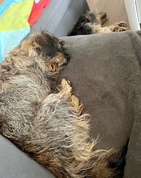Auch die erste Nacht hat er gut verbracht und durchgeschlafen. Jetzt schläft er auch gerade auf der Couch nach seinem 1. großen Spaziergang.