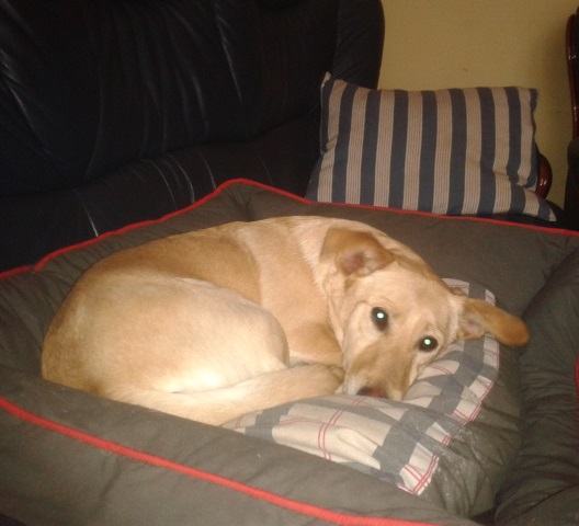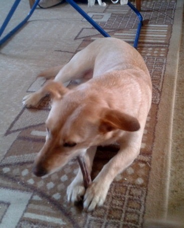 Goldi hat sich schon toll eingelebt. Sie läuft im Stall herum als ob sie schon immer da gewesen wäre und schaut sich alles von den anderen Hunden ab. Sie ist ein sehr gescheites Mädel. Aber am besten gefällt ihr, dass sie jetzt ein eigenes Haus und ein eigenes Bett hat. Und die Kauknochen, die sind auch superlecker.