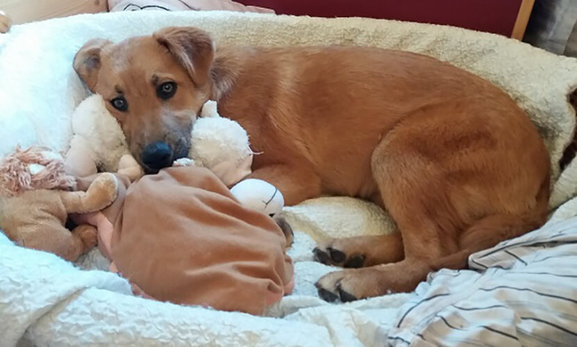 Es ist verblüffend, wie schnell sich das ehemals schüchterne Hunderl bei uns eingewöhnt hat. Sie geht prima an der Leine und auch ohne Leine. Sitzt mit Vorliebe vor dem Haus in der grünen Wiese und hat überhaupt keinen Gedanken daran, wegzulaufen.