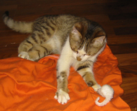 Wir haben ein alte Bettdecke auf der Boden gelegt, darunter verstecken die beiden ihren Mäuse (und findet sie wieder).
