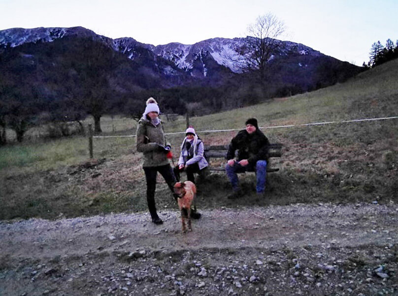War gestern Abend schon recht entspannt und hat sich auf der Couch breit gemacht. Im Schlafzimmer hat sie ihr Bettchen neben unserem, was sie auch sofort freudig angenommen hat. Fernseher war und Spiegel sind ihr sehr suspekt 😂 sie knurrt ihr Spiegelbild meistens an. Aber wir versuchen ihr alles so gut es geht zu erklären und zu zeigen. Beim spazieren gehen verhält sie sich sensationell. So waren wir heute mit meiner Schwester und ihrem Partner schon ein bisschen wandern und auf eine Jause im ca 45 min. entferntem Forellenhof.