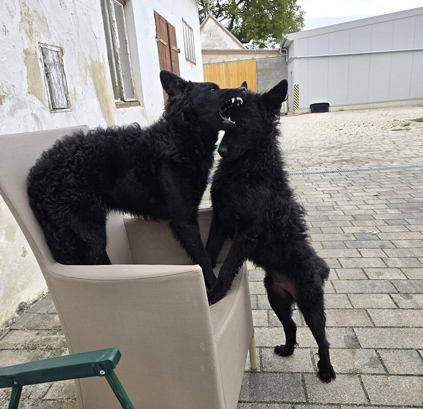Salsa hat ihn anfangs natürlich ordentlich auf Trab gehalten, wie es sich für einen kleinen schwarzen Wirbelwind gehört. Heute spielen, toben und kuscheln die beiden, als hätten sie nie etwas anderes gemacht. Manchmal wird gezickt, manchmal gestupst, aber meistens: einfach nur Mudi-Chaos vom Feinsten. 😄
