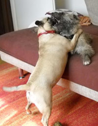 Jetzt weiß ich das ist Molly, die ist so alt wie ich und spielt so lieb mit mir und die wohnt auch bei uns. Mama hat gesagt sie ist ab nun meine Schwester. Aber am Anfang konnte ich die Dumpfbacke einfach nicht ausstehen. Mama hat mich dann mal laut zurechtgewiesen, weil ich hab sie immer angeknurrt und laut gebellt, ha ha, und dann hab ich eingesehen wie lieb sie ist. Jetzt spielen wir den ganzen Tag und es ist so lustig.