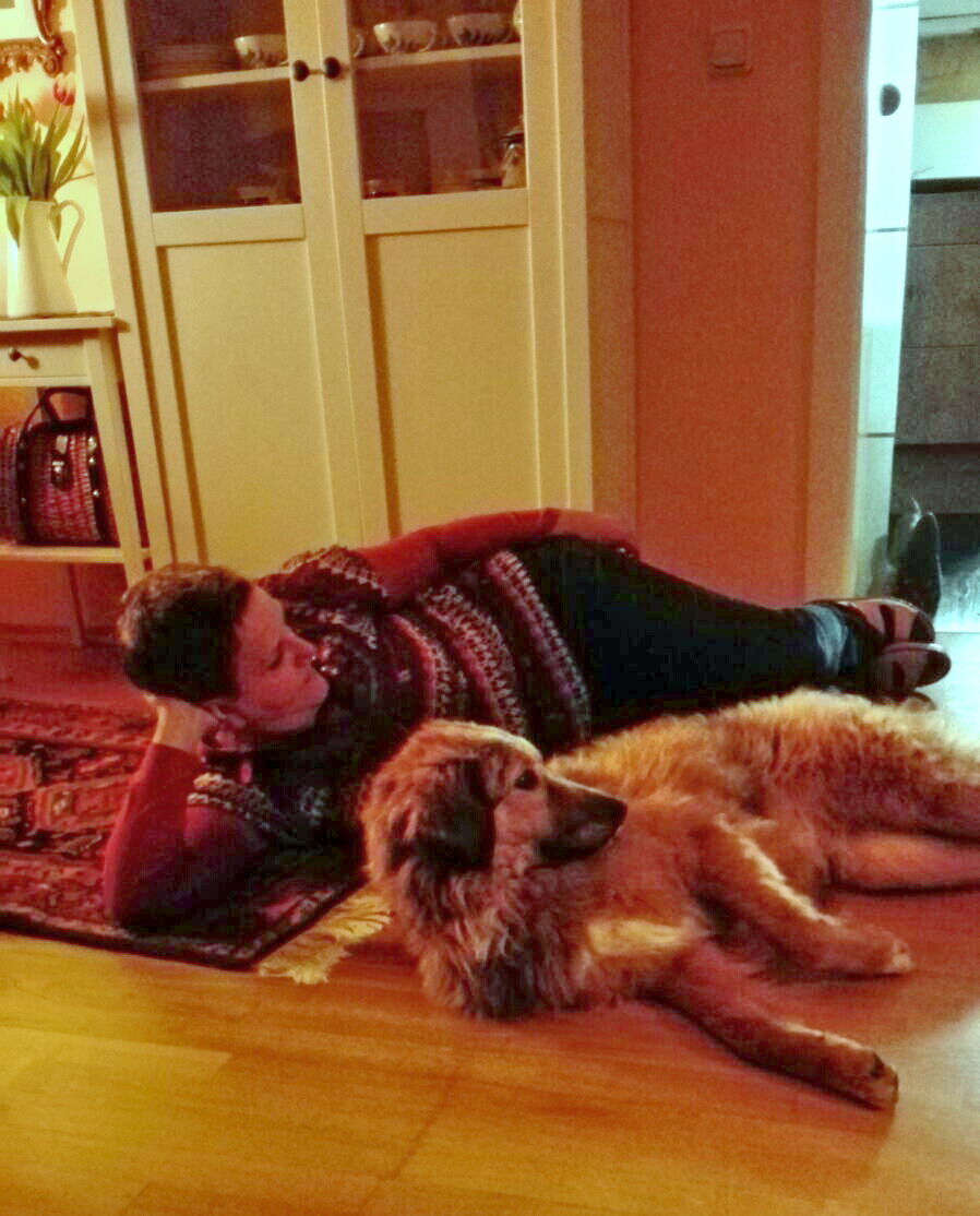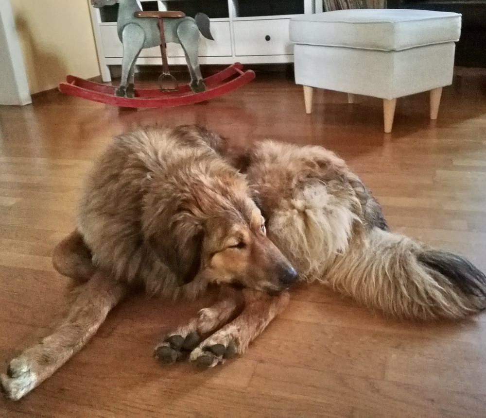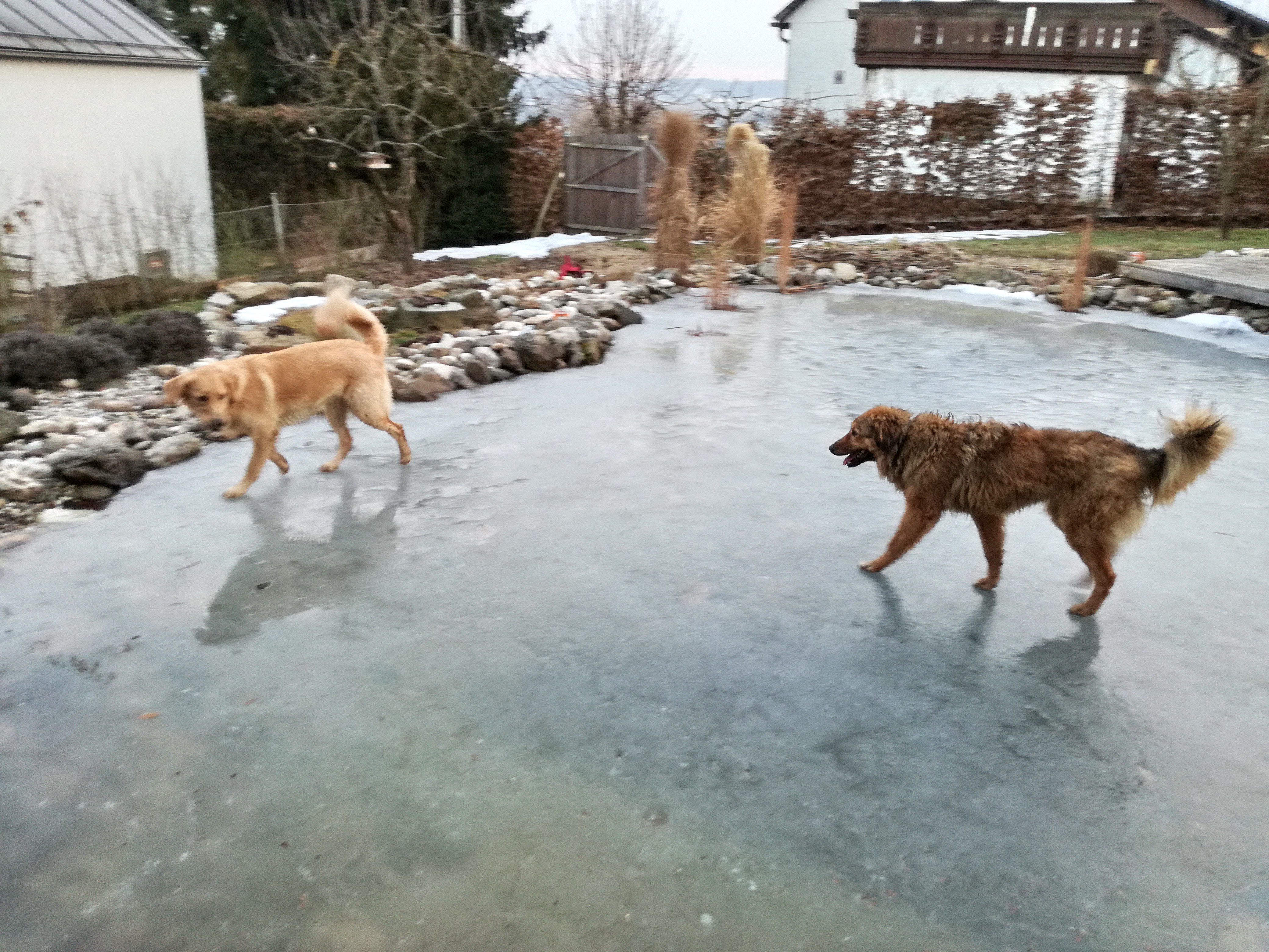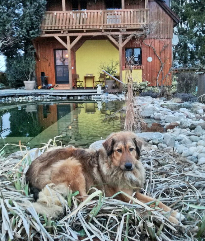 Auf den Fotos ist er liegend zu sehen, denn wenn Julio durch den Garten fegt, ist ein Foto zu machen, das scharf ist, unmöglich. 3-4 mal täglich sind wir mit ihm spazieren und es gibt ja so viel zu NEUES zu entdecken. Julios Lieblingsplatz ist an unserem Teich, aus dem er sehr gerne trinkt. Auf dem Foto, wo unser Haus auch zu sehen ist, "half" er mir bei der Gartenarbeit, indem er sich auf die abgestorbenen Blätter der Schwertlilien legte, die ich gerade abschneiden wollte. Julio ist immer mit dabei, im Haus, im Keller, im Garten!
