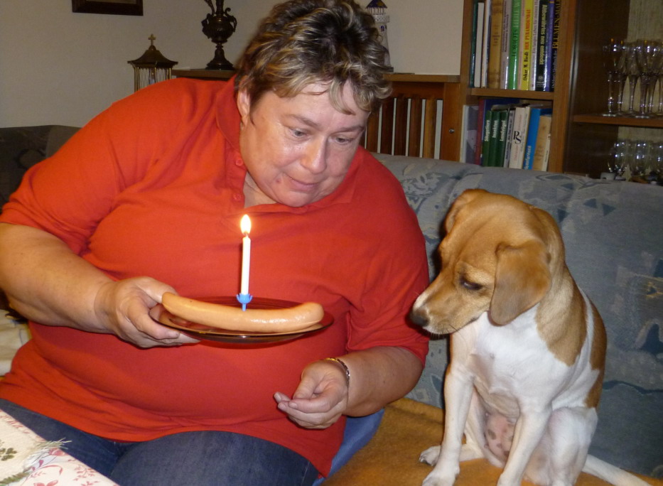 Am 1. Mai hatte ich meinen ersten Geburtstag! Gabi hat mir gleich in der Früh gratuliert und ein Würstchen mit einer Kerze gebracht.