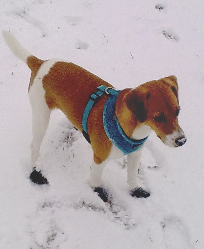Nun ist unsere kleine Kathy schon bald ein halbes Jahr bei uns. Mit ihr haben wir einen Glückgriff gemacht und sie zaubert jedem ein Lächeln auf die Lippen. Natürlich ist sie ein kleiner Lauser geblieben, aber so soll es auch sein, denn sie ist noch jung und übermütig, aber Kathy kann auch sehr brav und folgsam sein. Ich kann sie überallhin mitnehmen und das freut Kathy ganz besonders, denn am liebsten ist sie immer in meiner Nähe. Der erste Schnee hat sie sehr begeistert. Da ich sie auch nach Wien mitgenommen habe, musste Kathy „Schuhe“ anziehen. Ich war überrascht, sie hat ihr Pfötchen brav gehalten und auch im Auto keinen Schuh angeknabbert.