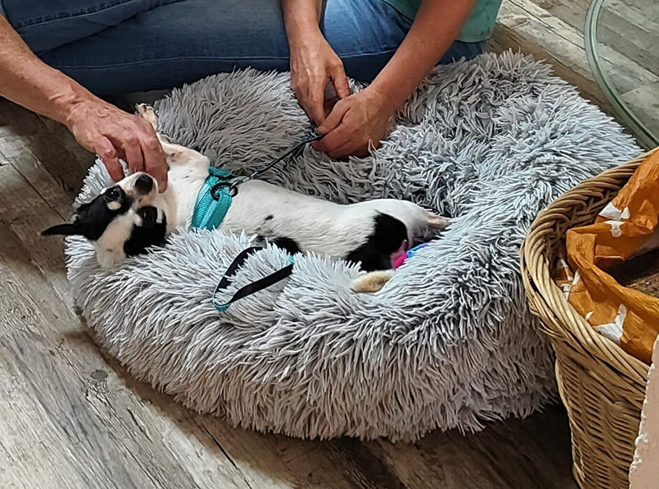 Im Auto hat sie eine offene Box, in der sie angeleint ist und auf meiner Beifahrerseite sitzt. Am Rücksitz hat sie sich als Entfesselungskünstlerin gezeigt und das war zu gefährlich.