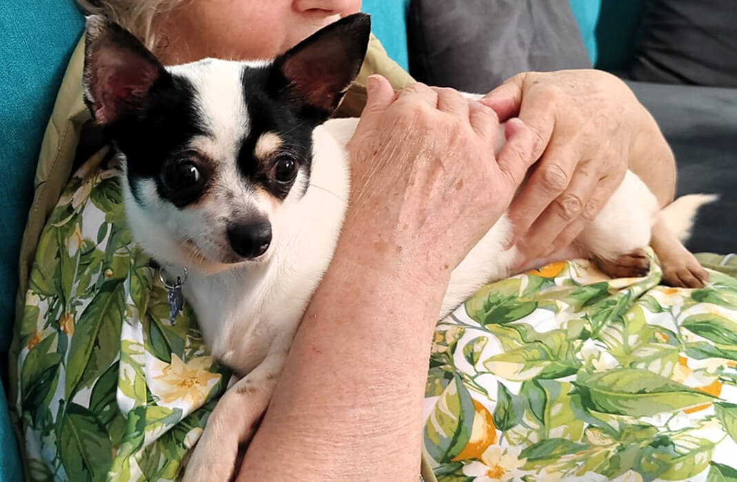 Mit einer Sofatreppe kann sie auf die Couch und mit uns kuscheln, wenn sie will.